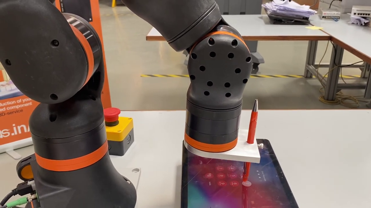In order to fulfil the requirements and offer a cost-effective solution, the decision was made to use a ReBeL 6-axis robot and equip the 6th axis with a touch pen. The test was successfully realised and, due to the very low costs, the investment was amortised within a few months.