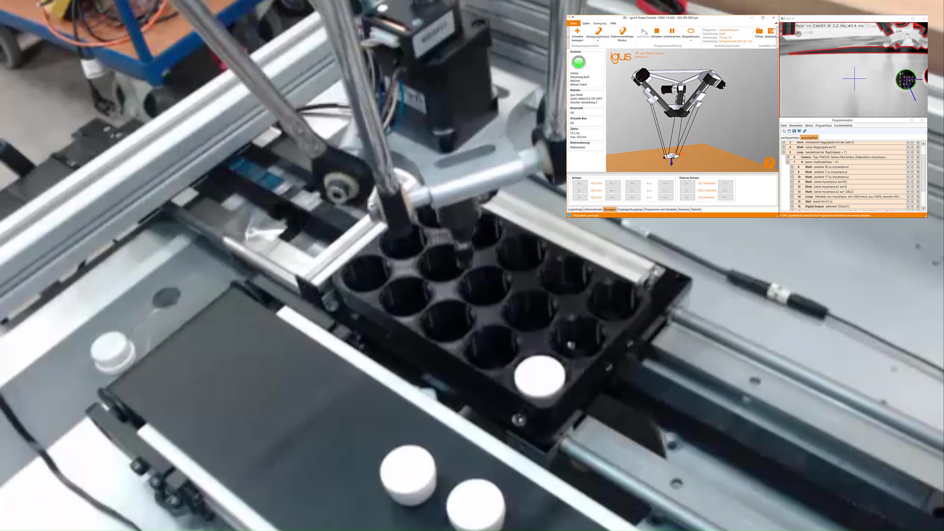 The delta robot transports small cans from a running conveyor belt into a box provided for this purpose. A camera is used to determine the exact position of the cans on the conveyor belt. This means that the cans do not have to be in exactly the same position on the conveyor belt to be picked up by the robot.