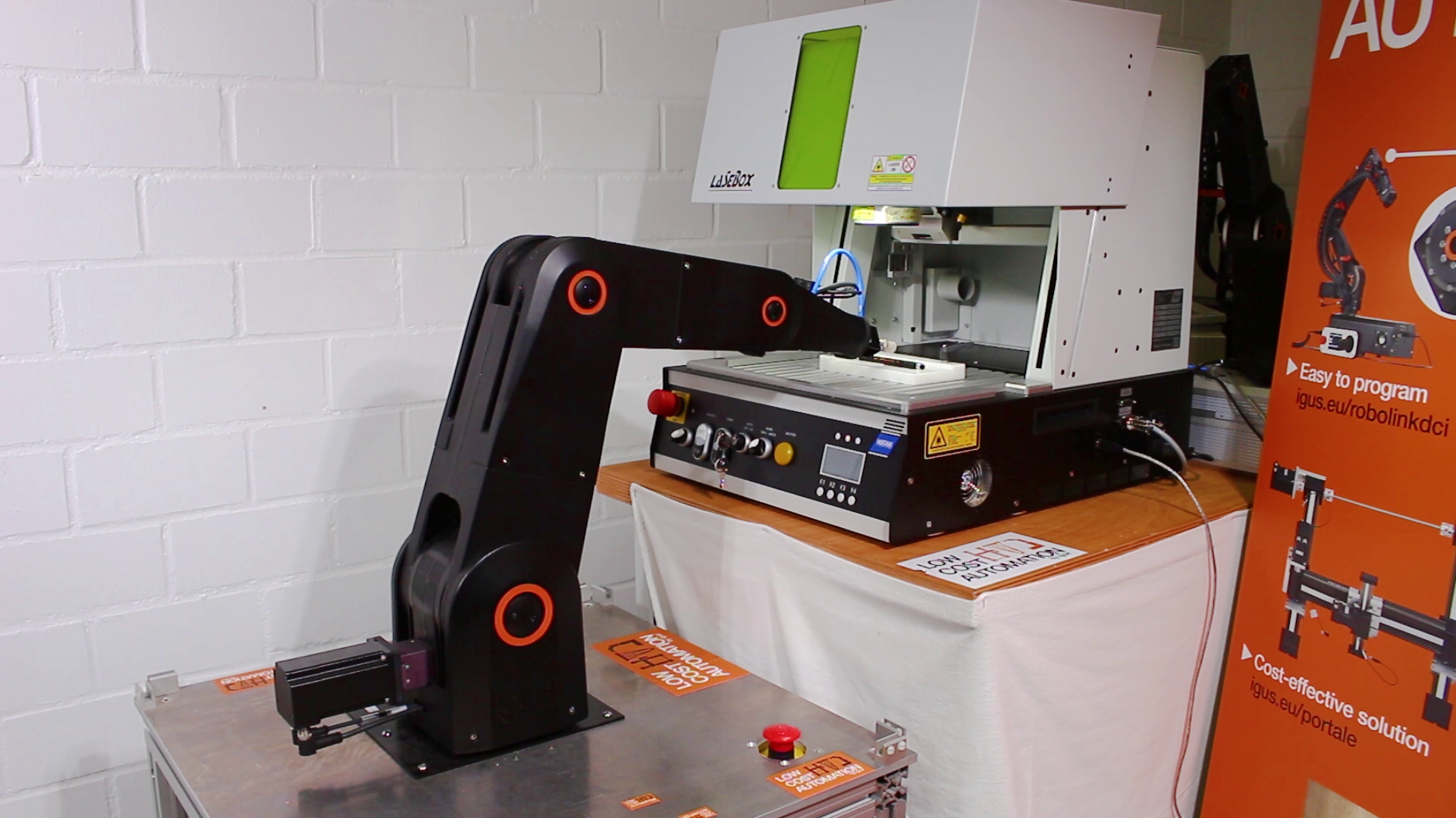 In this customer test, an articulated arm robot was used for a classic pick and place task. The goal was to pick up components, place them in the laser box and remove them again after the scanning process. As an example, a pen was used as a component. To pick up this thin pen, the robot was equipped with a small end effector.